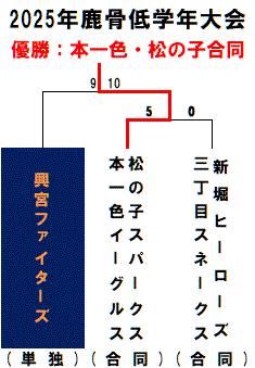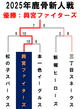 | 1位 | 興宮ファイターズ | 4勝 | 8○6 | 13○1 | 12○0 | 25○6 | ||